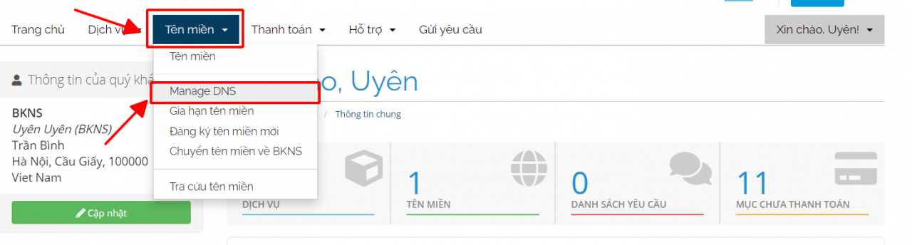 Đối với các tên miền đăng ký tại BKNS các bạn có thể hiện các bước sau trong quản lý dịch vụ để cập nhật các bản ghi nhanh nhất.