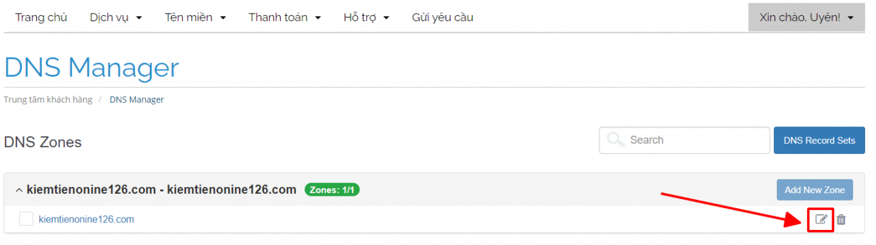Ảnh 2: Chọn tên miền và chỉnh sửa DNS.