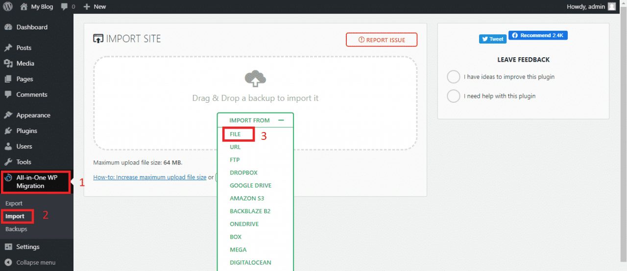 - Bạn click vào All in one Migration => Nhập (Import) => Tập tin (file) => Chọn file mà bạn đã xuất (Export) ở bước 1.2 vào. (với phiên bản miễn phí kích thước tối đa là 200MB, để tăng kích thước file import bạn phải trả phí lên bản nâng cấp)