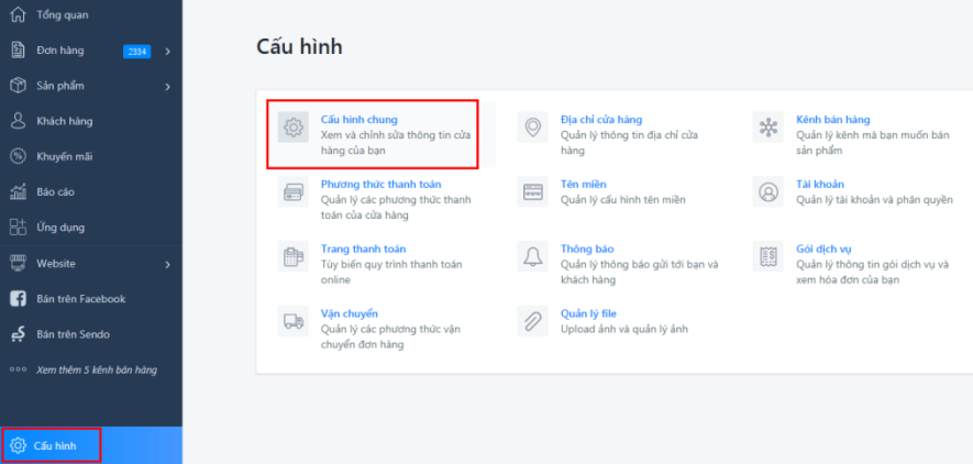 - Bước 7: Trong menu trang quản trị của Sapo Web, nhấp vào “Cấu hình“, chọn “Cấu hình chung“.