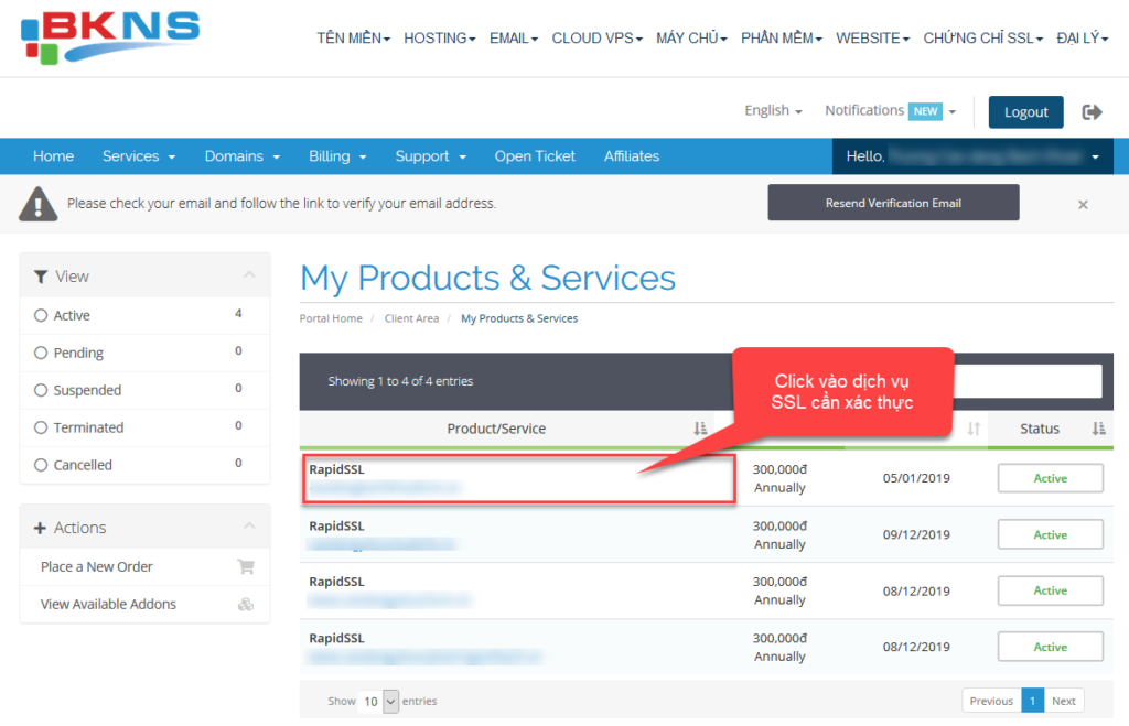 - Sau đó click vào dịch vụ SSL cần xác thực.