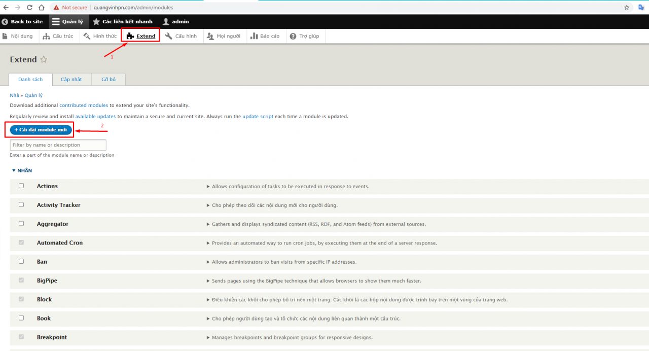 - Sau đó chọn tab Extend trên thanh điều hướng, chọn Install new module (Cài đặt module mới):