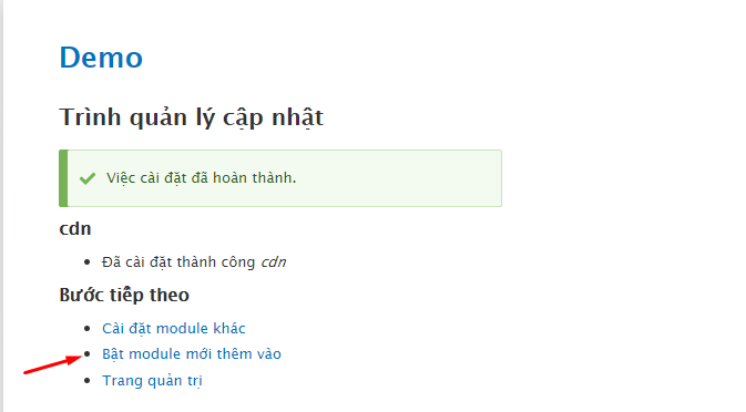 Sau đó chọn Install để cài đặt module CDN vào website của bạn. - Chọn tiếp Enable newly added modules (Bật module mới thêm vào) để kích hoạt module vừa cài đặt.