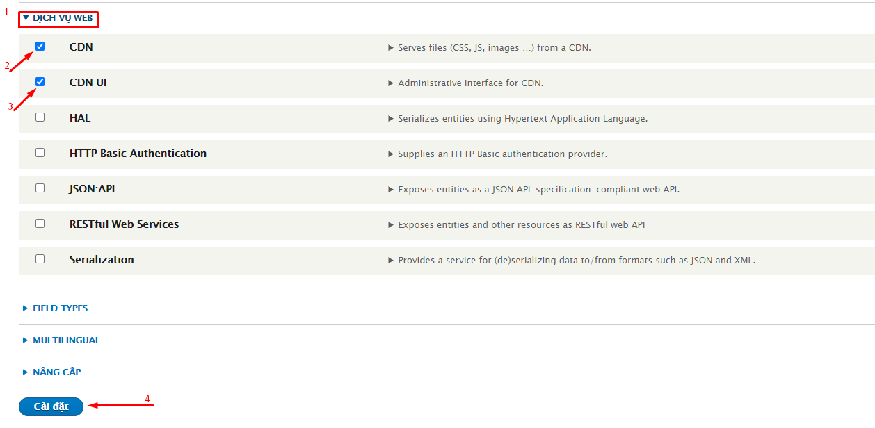 - Tại trang quản trị dịch vụ Web, cuộn xuống tìm module CDN sau đó tick chọn CDN và CDN UI sau đó nhấn chọn Install
