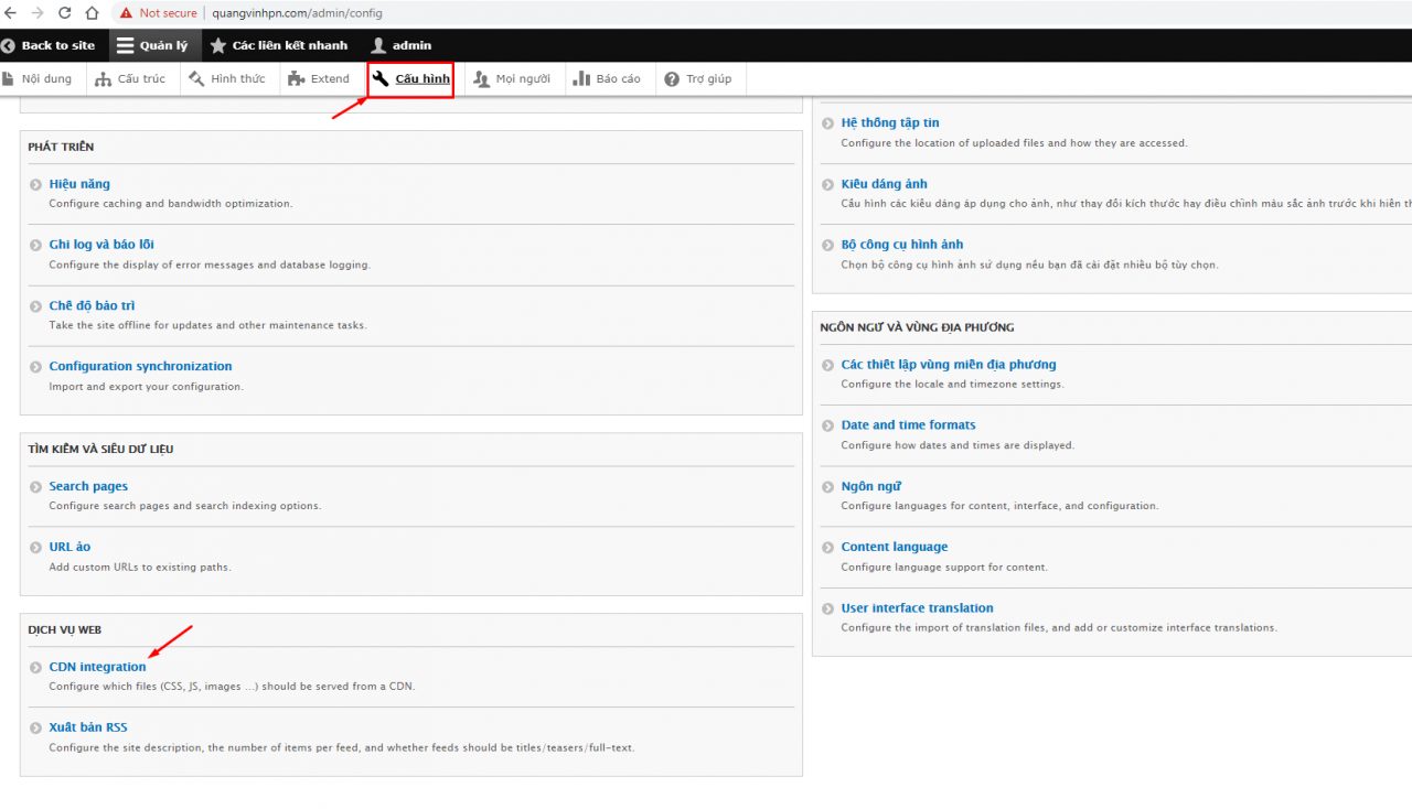 - Tại trang quản trị, chọn Configuration (Cấu hình) trên thanh điều hướng, chọn CDN integration