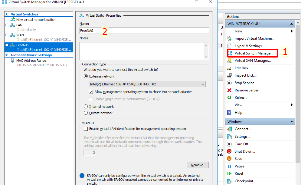 - Tại quản lý của Hyper-V ta chọn Virtual Network Manager để tạo một mạng ảo. Trong trường hợp này để tên là FreeNAS và để ở chế độ external network. Để lưu cấu hình ta chọn Apply -> OK.