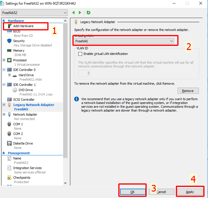 3. Chọn Add Hardware and Legacy Network Adapter. Ta lựa chọn card mạng đã tạo ở phần trước là FreeNAS. Tiến hành lưu lại cấu hình.