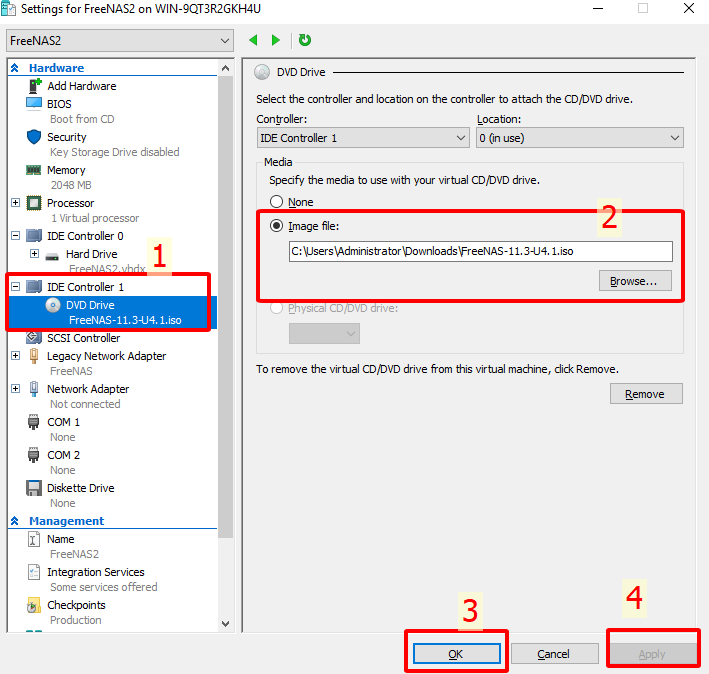 4. Chọn ổ đĩa trên IDE controller 1. Thêm đĩa cài FreeNAS và chọn Apply -> OK để trở lại trang quản lý.