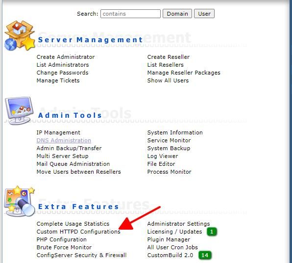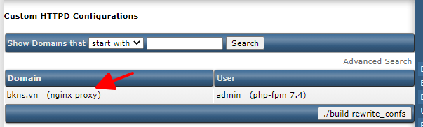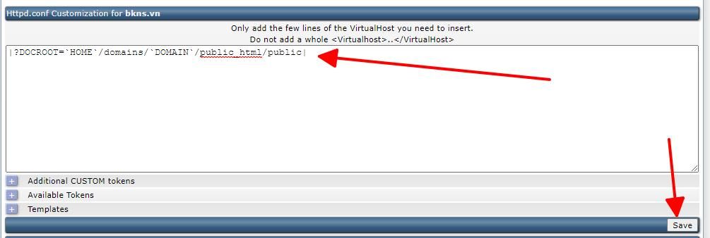 Đăng nhập admin chọn Custom HTTPD Configurations --> Click vào tên miền đang cài website --> thêm nội dung sau vào config như ảnh đính kèm