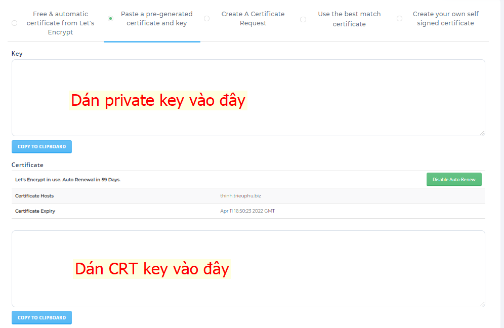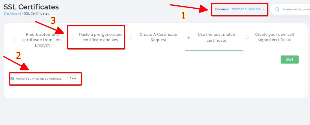 Bước 3: Lựa chọn domain để cài SSL ở số 1, tiếp theo các bạn tích vào Force SSL with https redirect rồi nhấn save để web tự chuyển thành https, cuối cùng tích vào Paste a pre-generated certificate and key