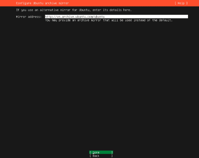 Cài đặt địa chỉ mirror cho ubuntu. Nhấn done để chọn mặc định