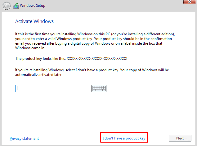Bước 10. Nếu bạn cài chạy làm Lab thì chọn: I do’nt have a product key. Còn nếu có key bản quyền thì nhập thẳng vào ô trong khung.