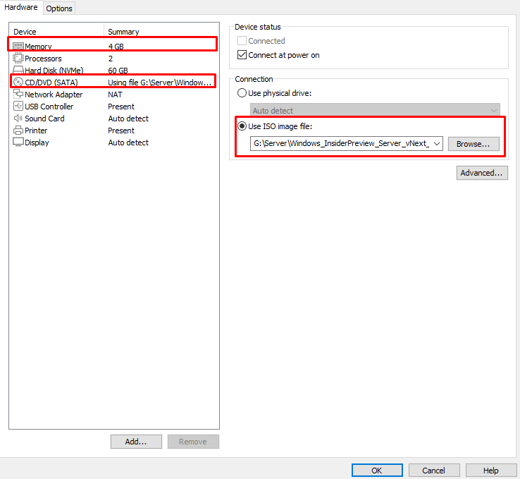 - CD/DVD: chọn đường dẫn lưu File ISO Windows Server.