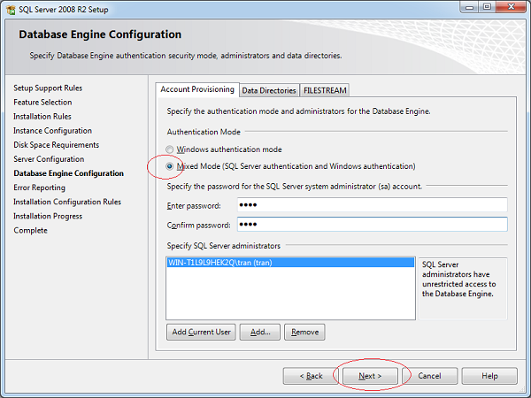 - (1) để cài đặt SQLServer