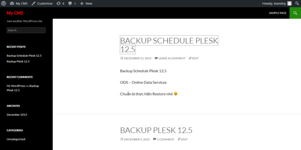 Chúng tôi sẽ đưa ra 1 ví dụ đơn giản như sau. Như hình dưới là hình ảnh của giao diện web được quản lý từ Plesk 12.5. Hiện tại với website này ta đang có 1 post tiêu đề là “Backup Schedule for Plesk 12.5”.