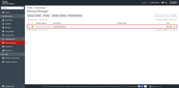 Bước 1: Tại giao diện chính của trang quản lý Plesk, chọn Tools & Settings => Backup Manager trong phần Tools and Resources. Tại đây đã có 1 file backup trước đó như trong hình dưới.