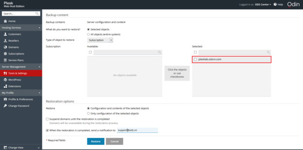 - What do you want to restore?: hệ thống sẽ hỏi bạn muốn restore theo kiểu lựa chọn đối tượng (Selected objects) hay là toàn bộ các đối tượng (All objects). Ở đây chúng tôi chỉ cần restore 1 đối tượng là plesk12-lab.odsvn.com.