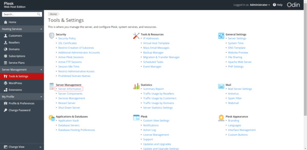 - Trên Plesk: Login vào Plesk với tài khoản admin. Sau đó vào Tools and Setting ở panel phía bên trái. Chọn Server Components trong mục Server Management.