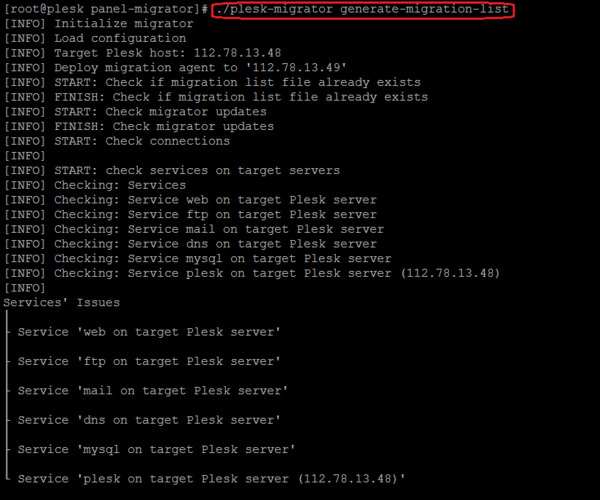 Thực hiện câu lệnh sau để kết nối đến server Cpanel và cài đặt Migration Agent đồng thời thu thập thông tin về hosting và reseller lưu tại file migration-list: