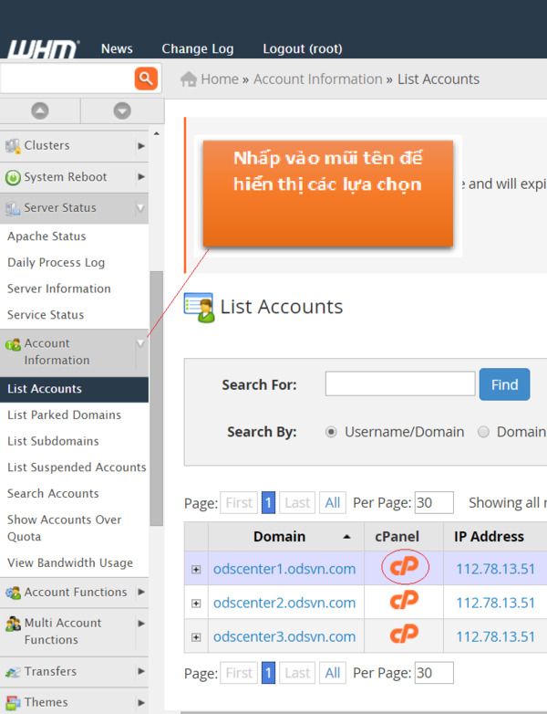 - Trên cPanel: Login vào cPanel với tài khoản root. Ở khung phía bên trái, vào Account Information > List Accounts > Nhấp vào biểu tượng cPanel.