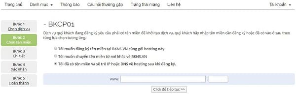 Bước 3: Ở bước này, bạn lựa chọn vào các ô bên dưới: chưa có tên miền, chuyển tên miền hoặc có tên miền. Sau đó điền tên miền vào và click “Click để tiếp tục“