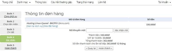 Bước 5: Thông tin về giá trị đơn hàng của bạn đã được tạo. Nếu bạn có mã giảm giá thì hãy điền vào. Nếu không có thì để trống. Sau đó bấm “Hoàn thành“