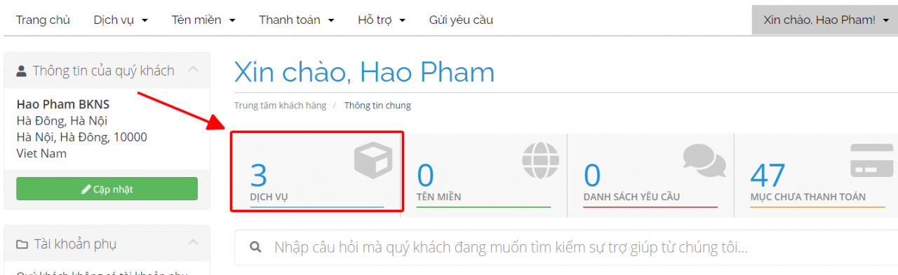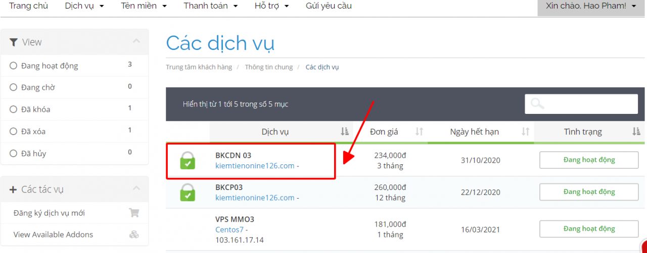Đăng nhập vào trang quản lý dịch vụ tại https://id.bkns.vn/clientarea.php