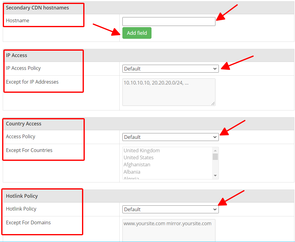 Đến bước này có thêm phần Advanced Setting, trong mục nâng cao này các bạn có thể tùy chọn thay đổi cấu hình thêm cho CDN Resource của các bạn như Add thêm CDN Hostname, cho phép hay chặn người dùng cuối truy cập vào CDN Resource của bạn. Nếu không có gì thay đổi các bạn nên để mặc định.