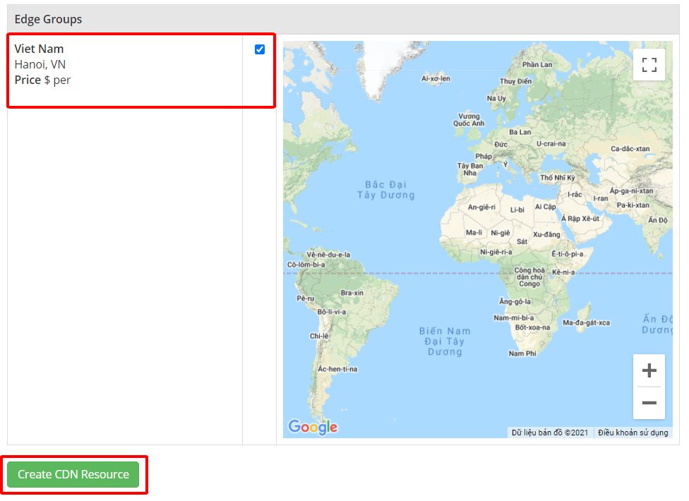 Ảnh 5: Chọn khu vực: Tích chọn vào khu vực mà bạn muốn triển khai CDN, sau đó chọn Create CDN Resource để hoàn tất thiết lập.