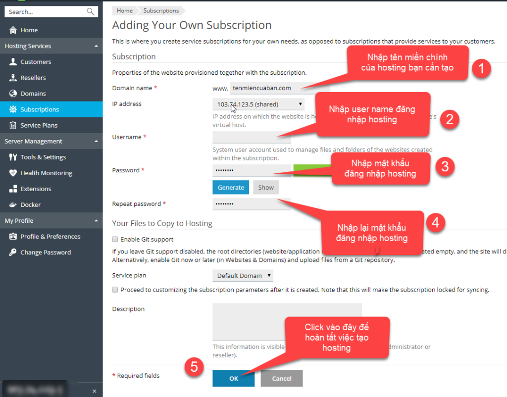 Các bạn có thể thực hiện theo các bước dưới đây để tạo 1 hosting trên VPS với quyền admin