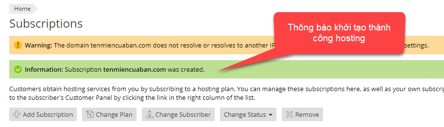 Đến đây bạn sẽ nhận được thông báo dòng chữ màu xanh nghĩa là đã tạo thành công hosting và sẽ xuất hiện tên domain của bạn ở dưới, bạn click vào tên miền cần quản lý để có thể thao tác với tên miền đó.