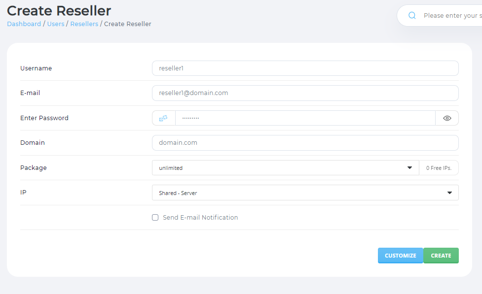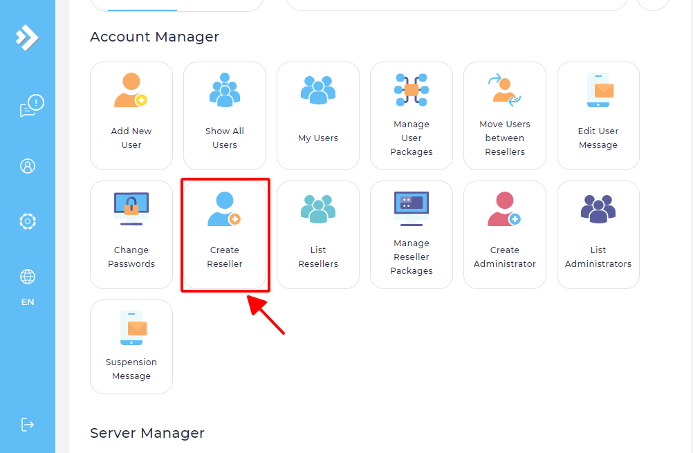 Tài khoản Reseller là tài khoản dưới quyền của admin được tạo ra để giúp admin tạo các user và quản lý các user theo quyền hạn của admin trao cho. Sau đây là các bước tạo tài khoản Reseller.