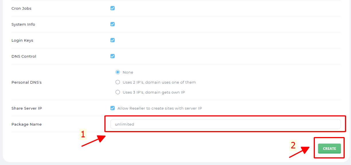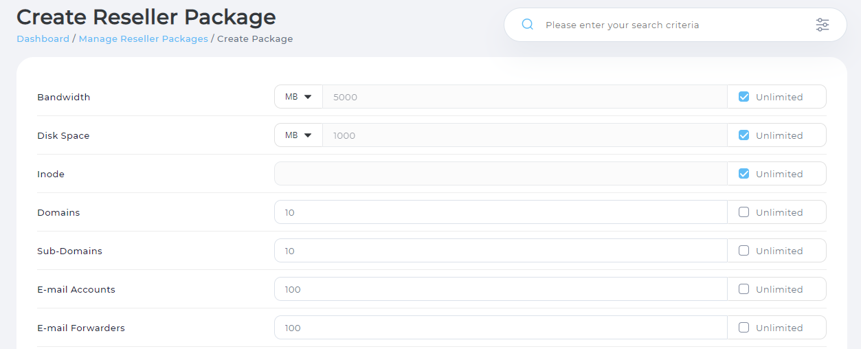 Reseller Package là nơi các bạn có thể cấu hình những chức năng để phân quyền cho tài khoản Reseller như tài nguyên lưu trữ, băng thông, domains, email,…Sau khi đã tạo các Packages các bạn có thể gán cho các tài khoản Reseller thay vì phải vào từng tài khoản để cấu hình chức năng.