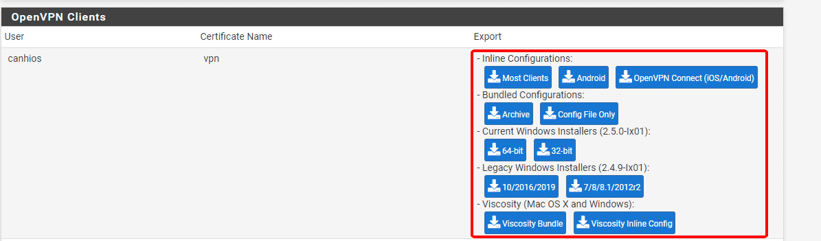 Chọn Client Export: Sau đó các bạn kéo xuống dưới cùng và chọn user mới tạo và download file cài theo Hệ Điều Hành tương ứng.