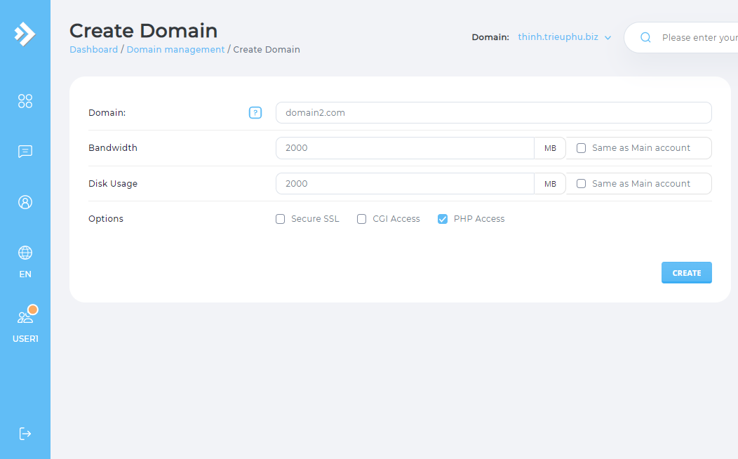 Bước 4: Các bạn nhập các thông tin của domain như tên domain băng thông,… Sau đó nhấn Create.
