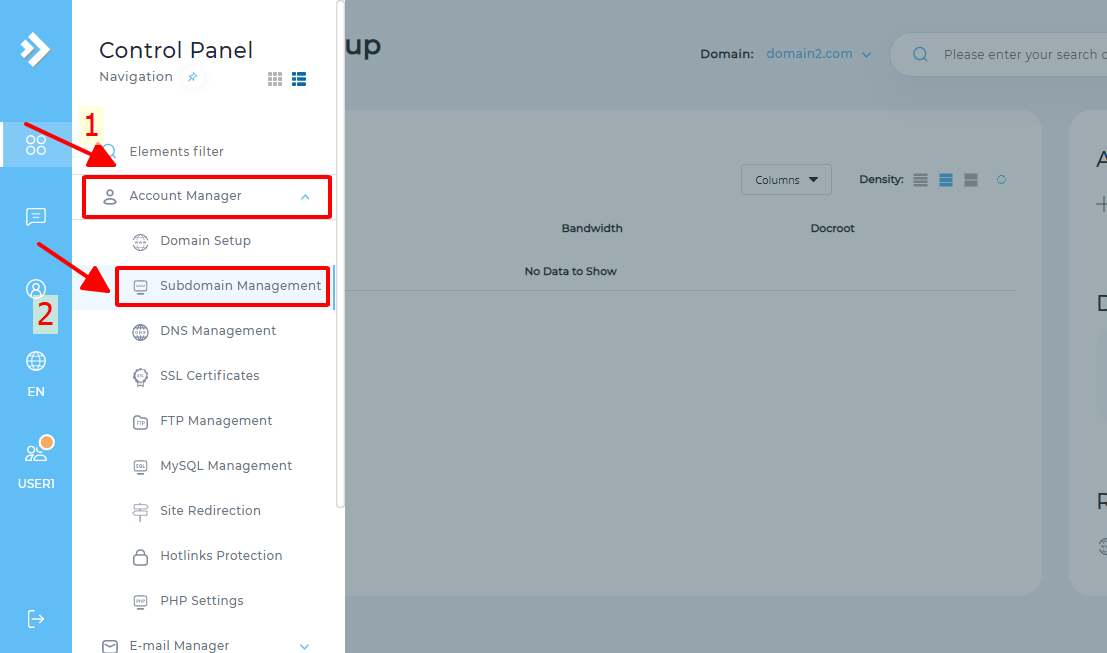 Bước 2: Từ thanh công cụ bên trái các bạn chọn Account Manager -> Subdomain Management.