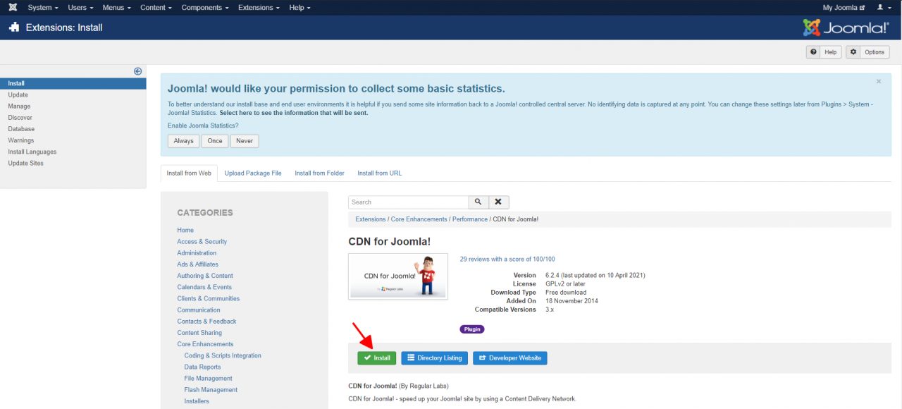 Tại trang quản trị Joomla chọn Install Extensions, chọn Install from Web, gõ tên Extensions CDN for Joomla tại ô tìm kiếm, chọn Extensions như hình, sau đó chọn Install để cài đặt Extensions