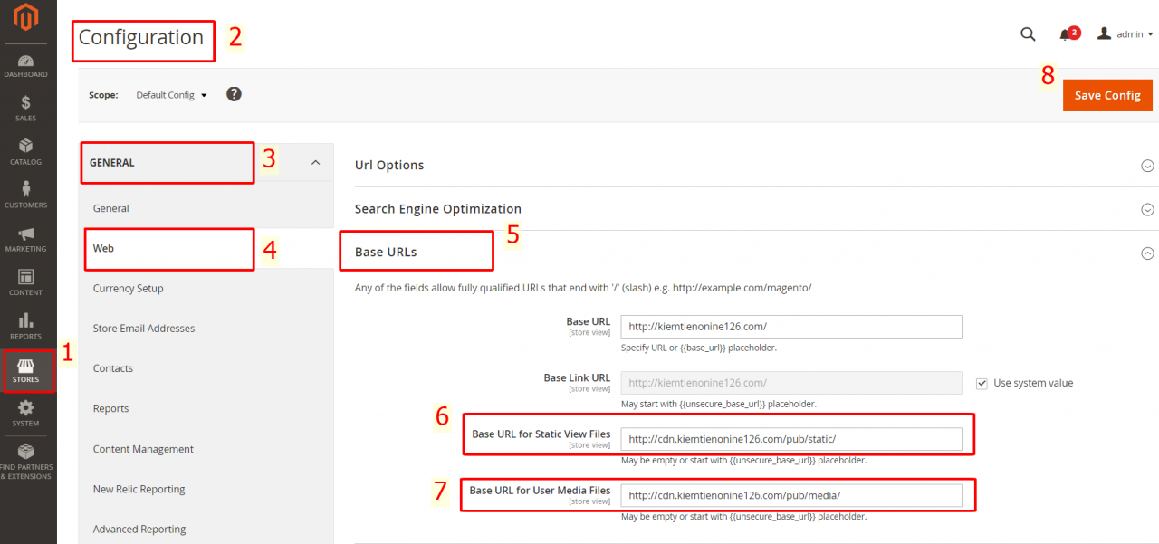 Chuyển tiếp các mục Stores -> Configuration -> General -> Web -> Base URLs và cập nhật đường dẫn CDN.
