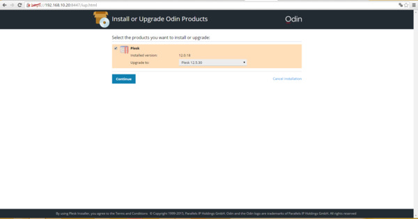 Bước 2: Sau khi login thành công, ta chọn tab “Install or Upgrade Product” sau đó chọn phiên bản Plesk muốn nâng cấp và chọn Continue. Ở đây ta chọn bản Plesk 12.5.30