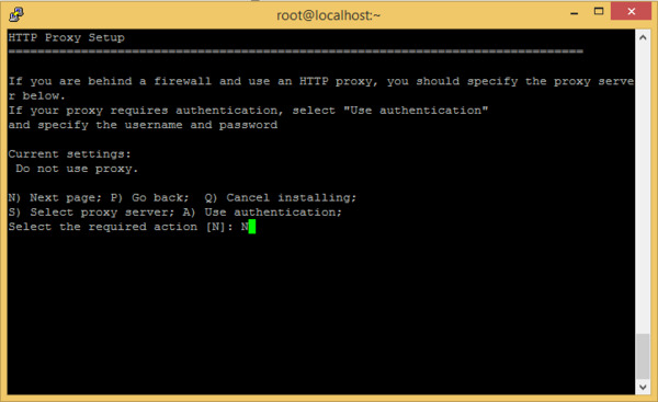 Bước 5: Tại bước này, ta có thể lựa chọn proxy server (S) hay sử dụng Chứng thực bằng user pasword (A). Sau khi đã hoàn tất cấu hình, ta chọn N để tiếp tục bước tiếp theo
