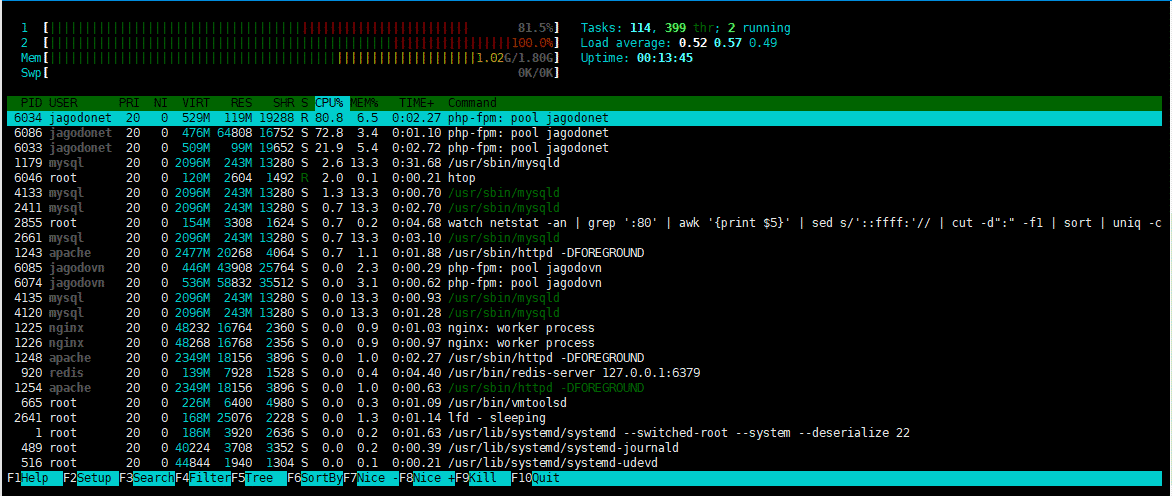 Sau khi đã cài đặt htop các bạn có thể chạy lệnh sau để khởi chạy htop:
