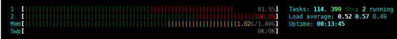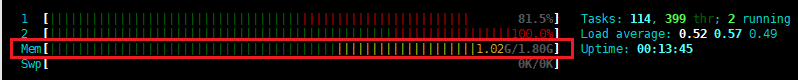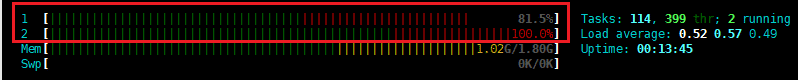 Các dòng được khoang đỏ hiển thị phần trăm CPU đang được sử dụng. Đối với một CPU lõi đơn, sẽ có một dòng cho hiển thị mức đang sử dụng, nếu sử dụng CPU đa lõi, sẽ có n số dòng tùy thuộc vào số lõi của CPU. Trong trường hợp, nếu phần trăm CPU sử dụng gần 0% thì có nghĩa là CPU không có nhiều tải nhưng khi phần trăm CPU sử dụng tiếp cận 100% trong một thời gian dài, điều đó có nghĩa là CPU đang quá tải.