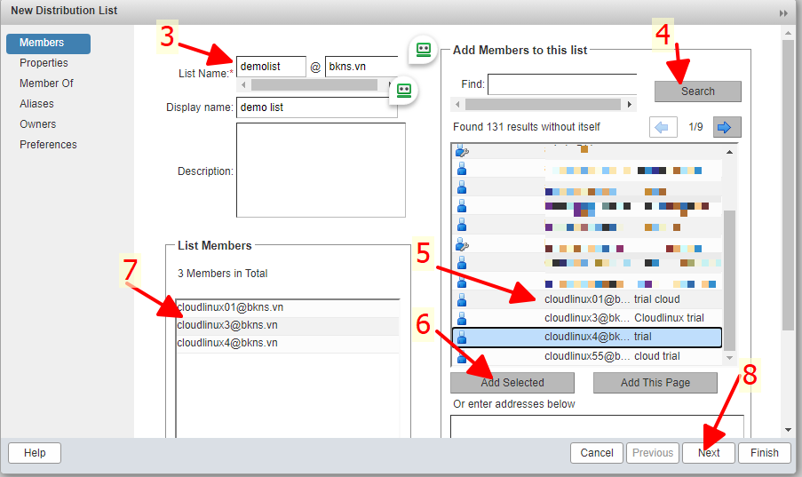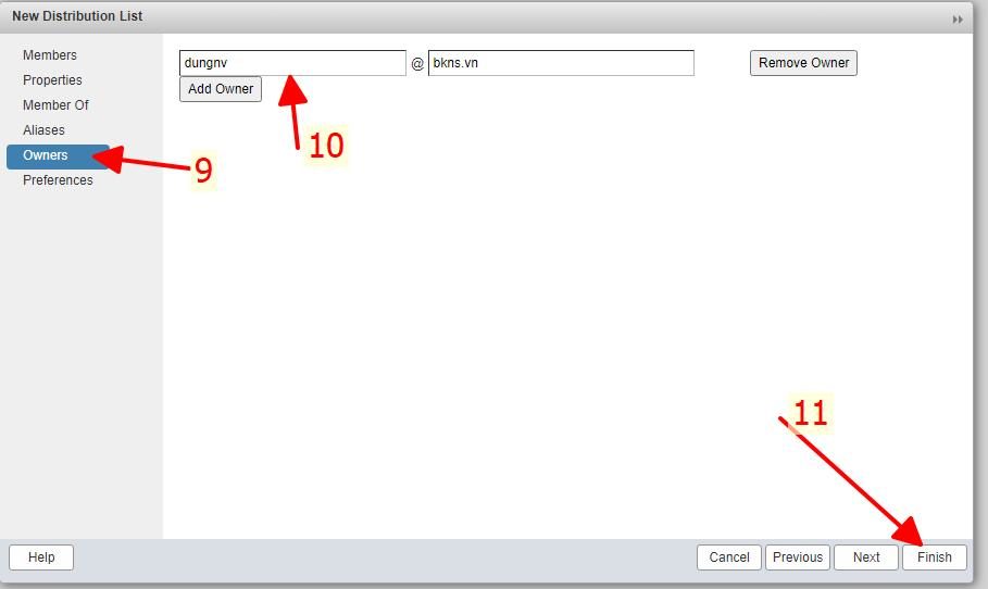 Sau khi next đến vị trí Owners như số 9 đánh dấu ở trên. điền email quản lý distribution list email này sẽ quản lý thêm sửa xóa các thành viên trong list.