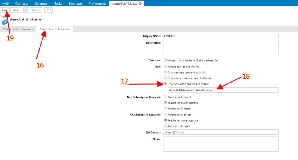 18: Nhập tên các user cho phép gửi tới distribution list, sau khi xong ấn save